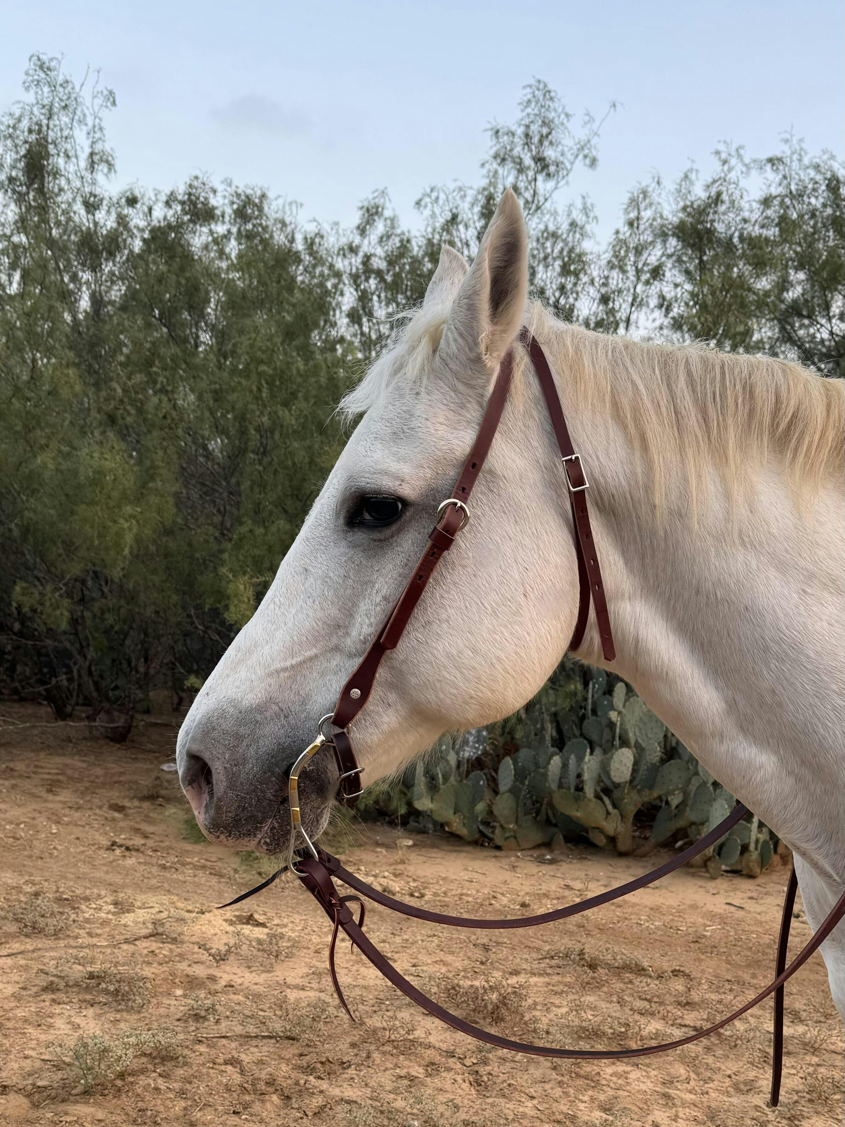 The Horizons Collection features great basic tack perfect for everyday riding. This single-ply 5/8" durable, weather resistant harness leather headstall features a doubled and stitched rolled earpiece for easy positioning. Double cheek adjustments provide a great fit. Chicago screw bit ends. Durable nickel plated hardware. Horse size.